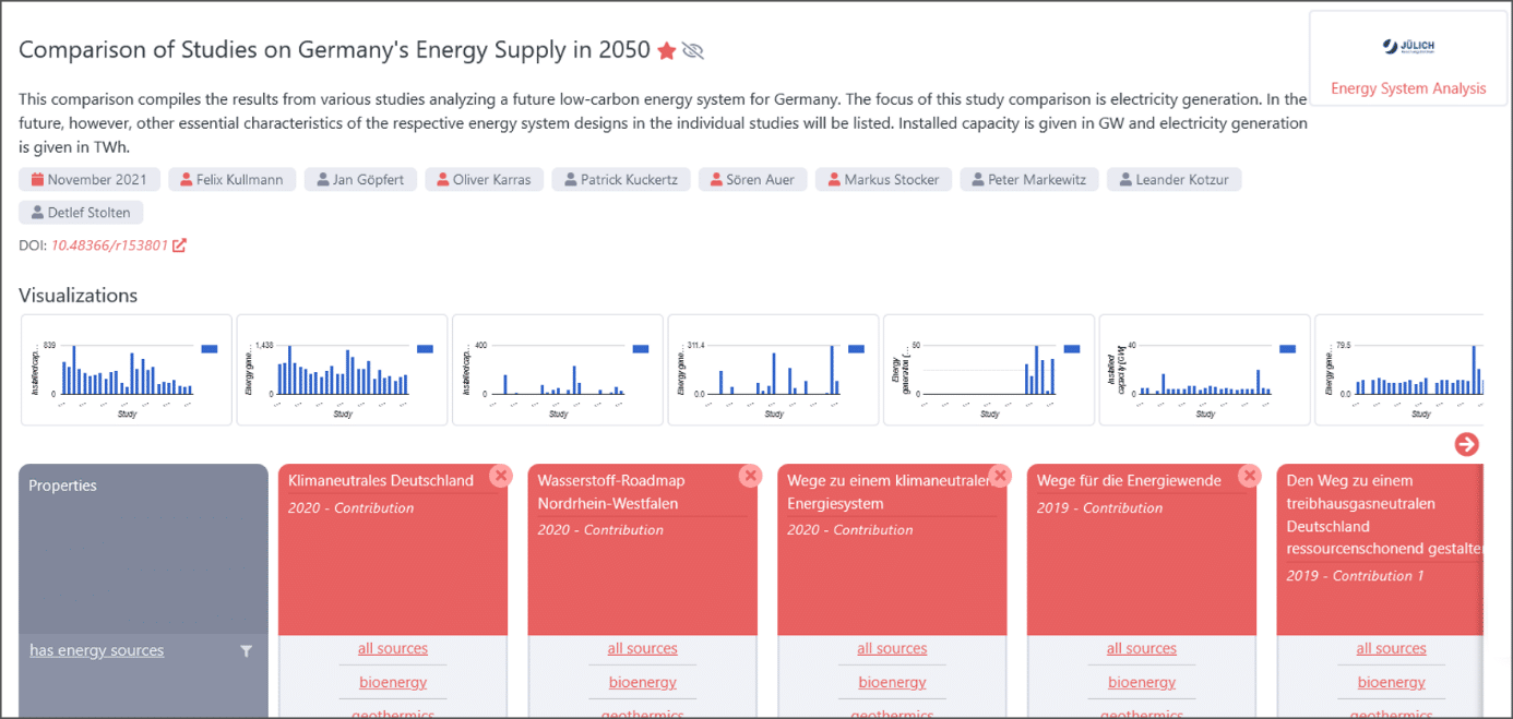 - Kullmann, J. Göpfert, O. Karras, P. Kuckertz, S. Auer, M. Stocker, P. Markewitz, L. Kotzur, and D. Stolten: Comparison of Studies on Germany’s Energy Supply in 2050. Open Research Knowledge Graph, 2021, DOI: 10.48366/R153801.